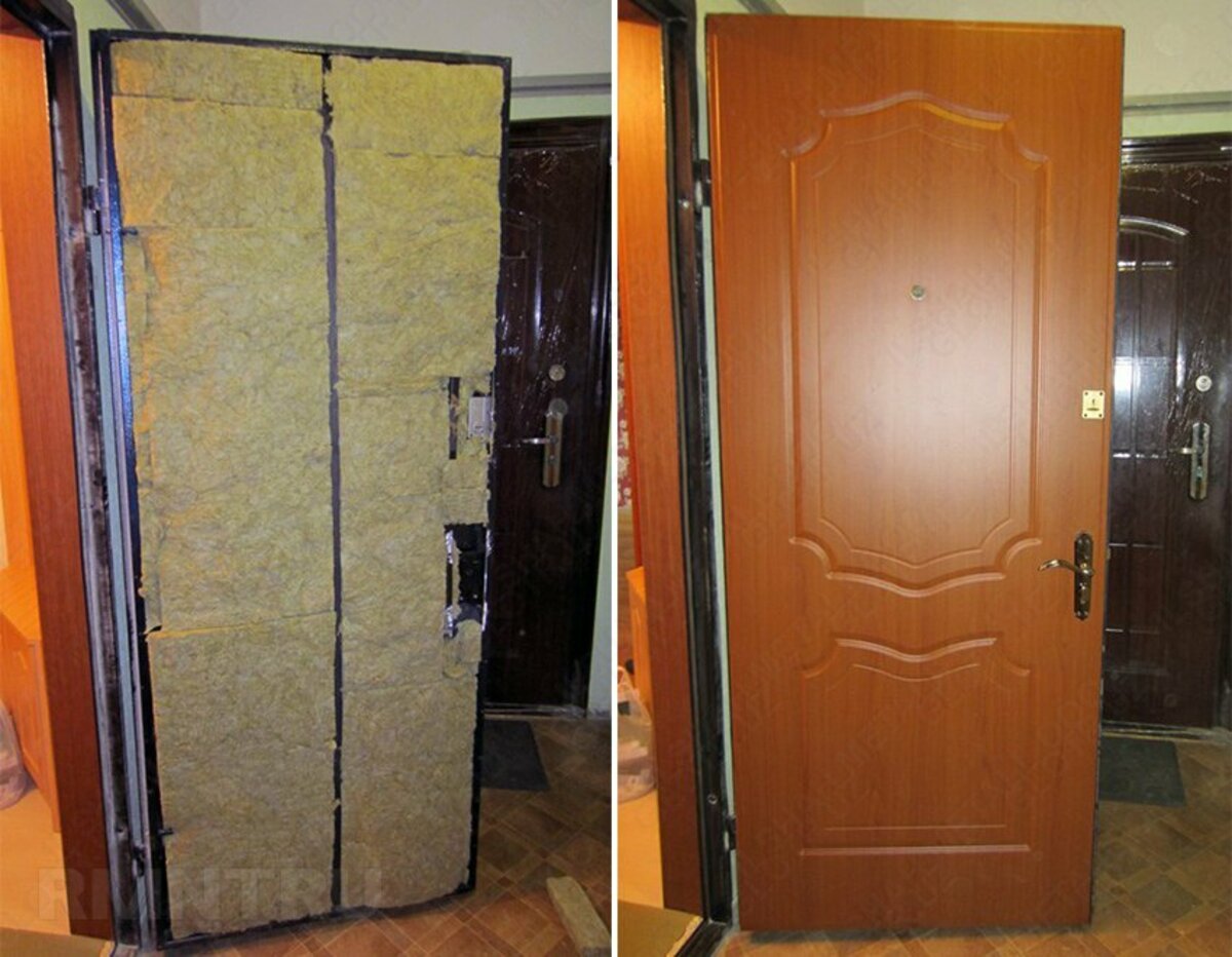 С двери со съемной обшивкой снимается декоративная панель, после чего пространство заполняется минеральной ватой, либо другим материалом. Снимается внутренний металлический лист, если он присутствует, и полость заполняют звукоизолирующим материалом, который закрепляется с помощью клея.